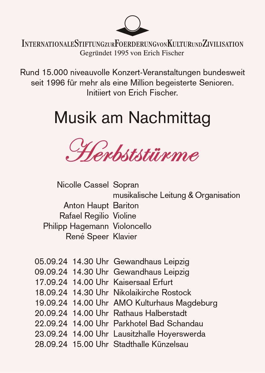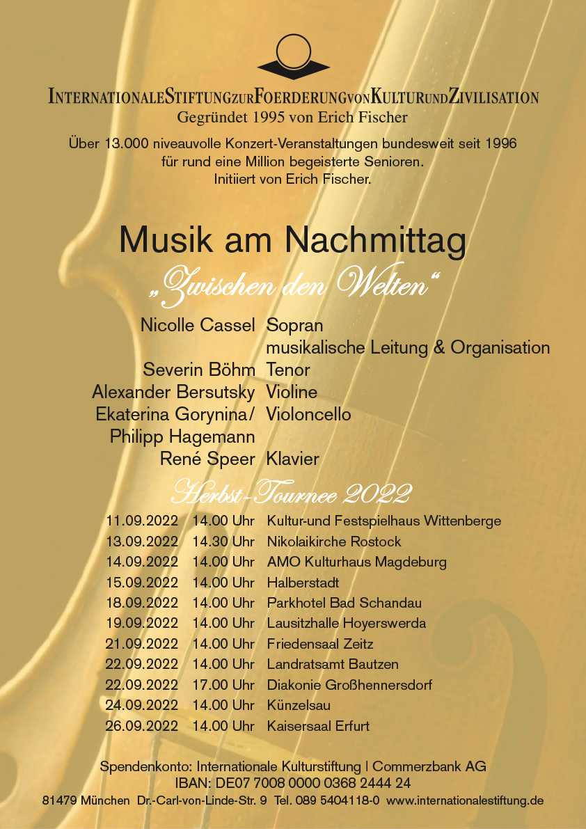 Musik am Nachmittag | öffentliche Konzerte in festlichen Sälen | Herbst Tournee 2022 vom 11.09. bis 26.09.2022