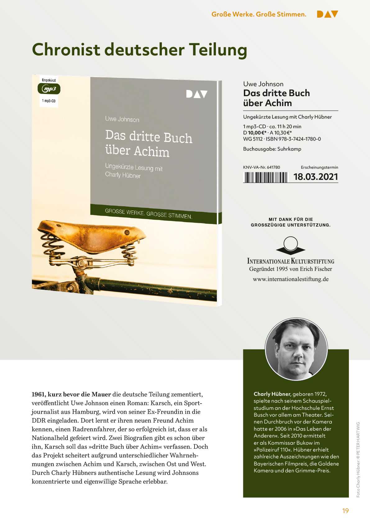 “Das dritte Buch über Achim” von Uwe Johnson ungekürzte Lesung mit Charly Hübner | Hörbuch – ET 18.03.2021 | DAV – Der Audio Verlag