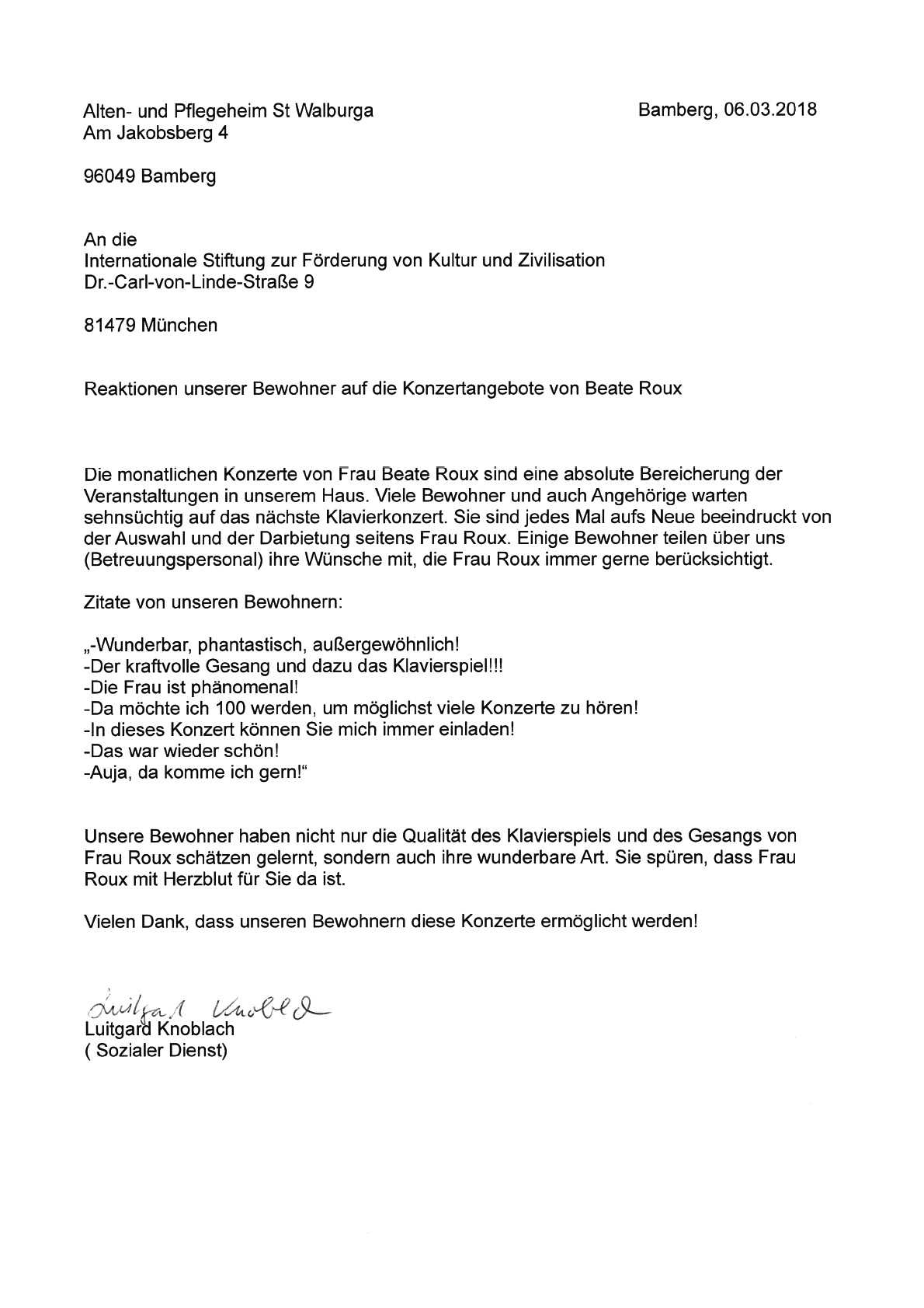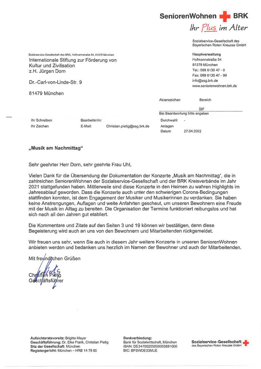Dankschreiben der Geschäftsführung der Sozialservice-Gesellschaft des BRK, München zur "Musik am Nachmittag" Dokumentation 2021 | 27.04.2022