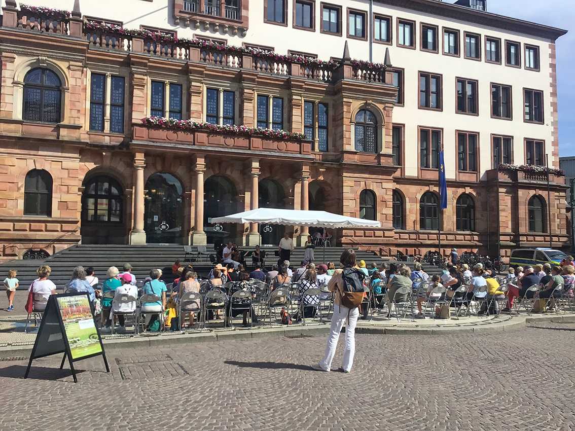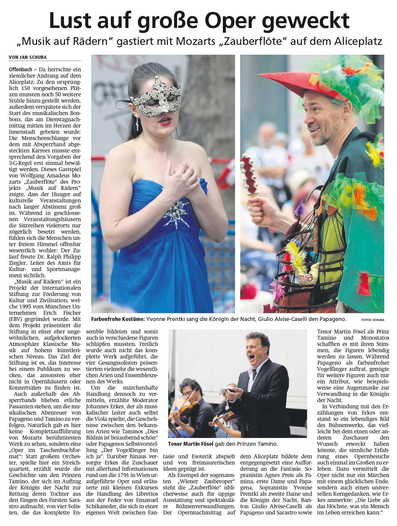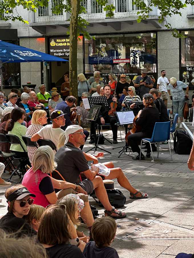 Es ist natürlich nicht zu vergleichen mit einer Aufführung in einem Saal und um ehrlich zu sein hatte ich manchmal Probleme, mich auf das Geschen zu konzentrieren; die Flugzeuge, hupende E-Scooter, tobende Kinder, bellende Hunde und … der Kirchturm, der zwei mal, zur vollen Stunde, alles gegeben hat - und zwar mit Erfolg - die Musik und den Gesang auf dem Platz zu übertönen 😁
