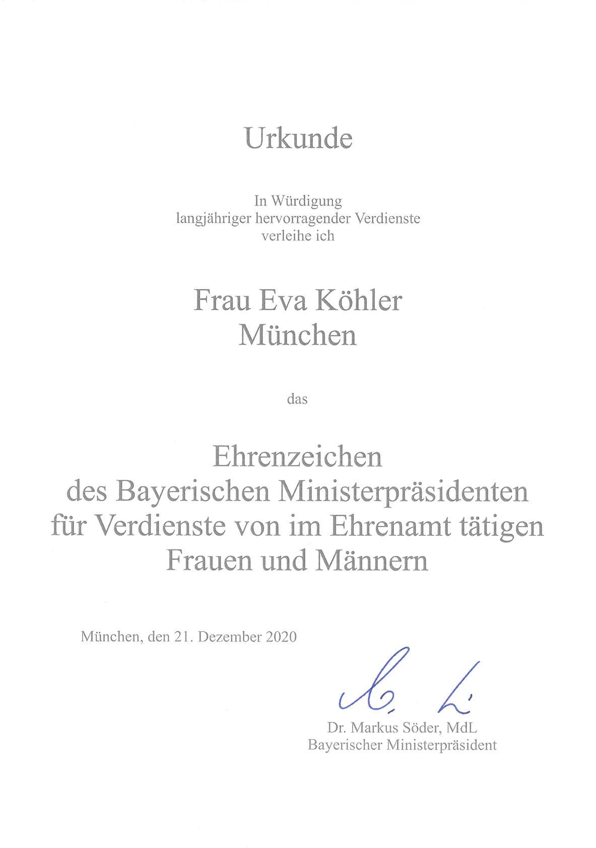 am 6. Oktober 2021 | Verleihung des Ehrenzeichens des Bayerischen Ministerpräsidenten für Verdienste von im Ehrenamt tätigen Frauen und Männern anlässlich des 25-jährigen Jubiläums der Internationalen Stiftung in 2020.