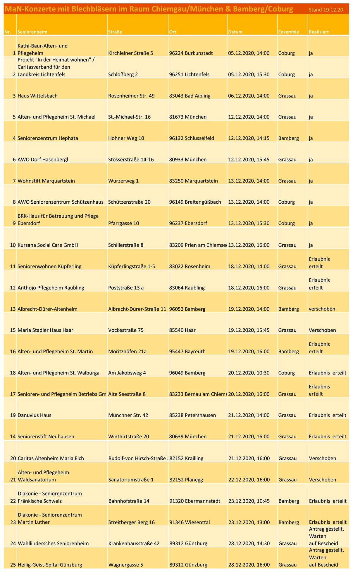 Konzerte mit Blechbläser Ensembles in der Vorweihnachtszeit – im Freien! – für Altenheimbewohner